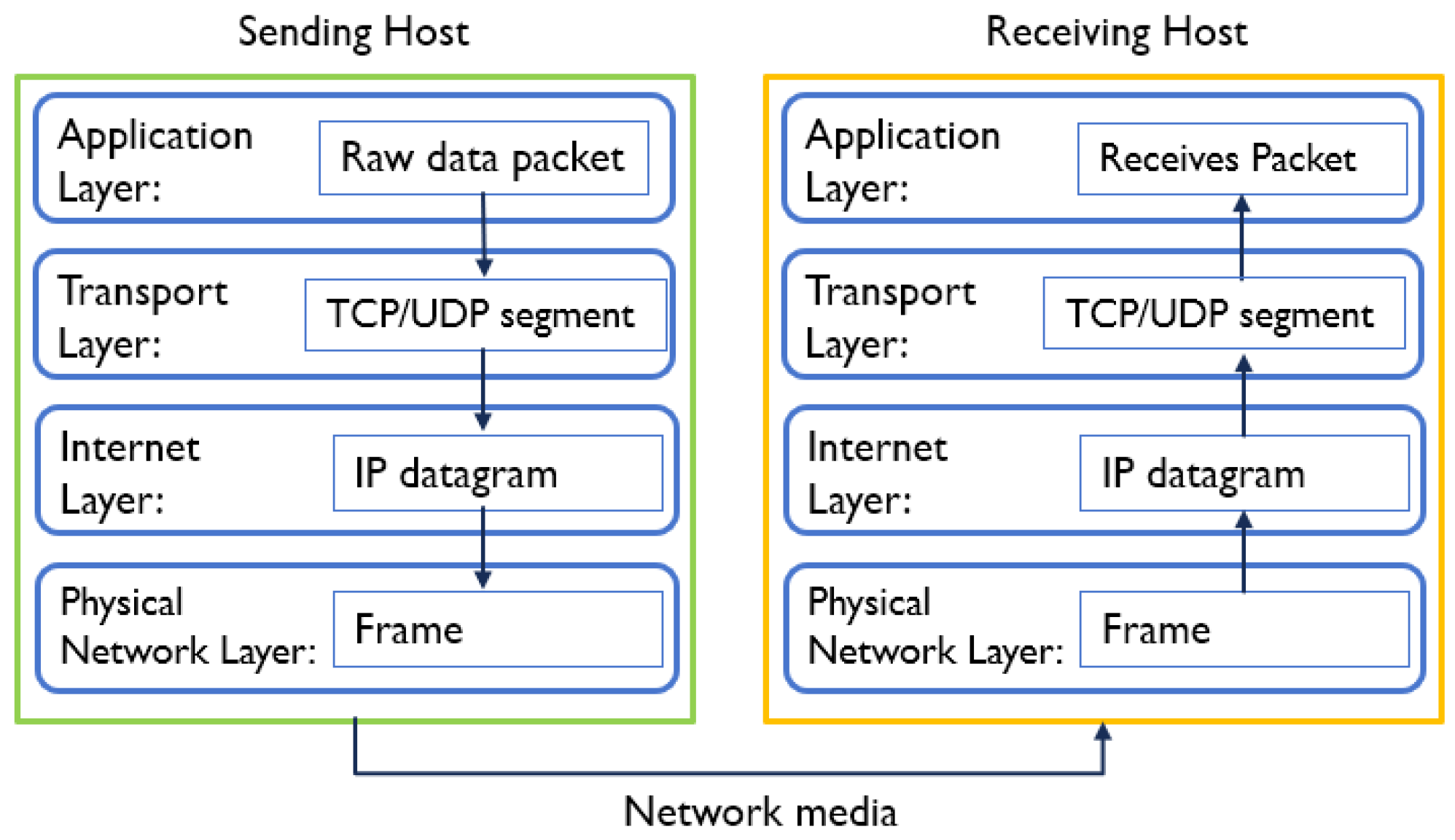 Figure 6 presents the steps involved in the TCP/IP model. The application layer in the client generates raw data, which is passed to the transport layer and encapsulated into a TCP or UDP segment, depending on the protocol. This layer adds a header with details such as source port, destination port, and sequence number. The segment then moves to the Internet layer, where the IP protocol adds its header containing the source and destination IP addresses. Then, the IP packet is passed to the network access layer for physical transmission using Wi-Fi or Ethernet protocols [