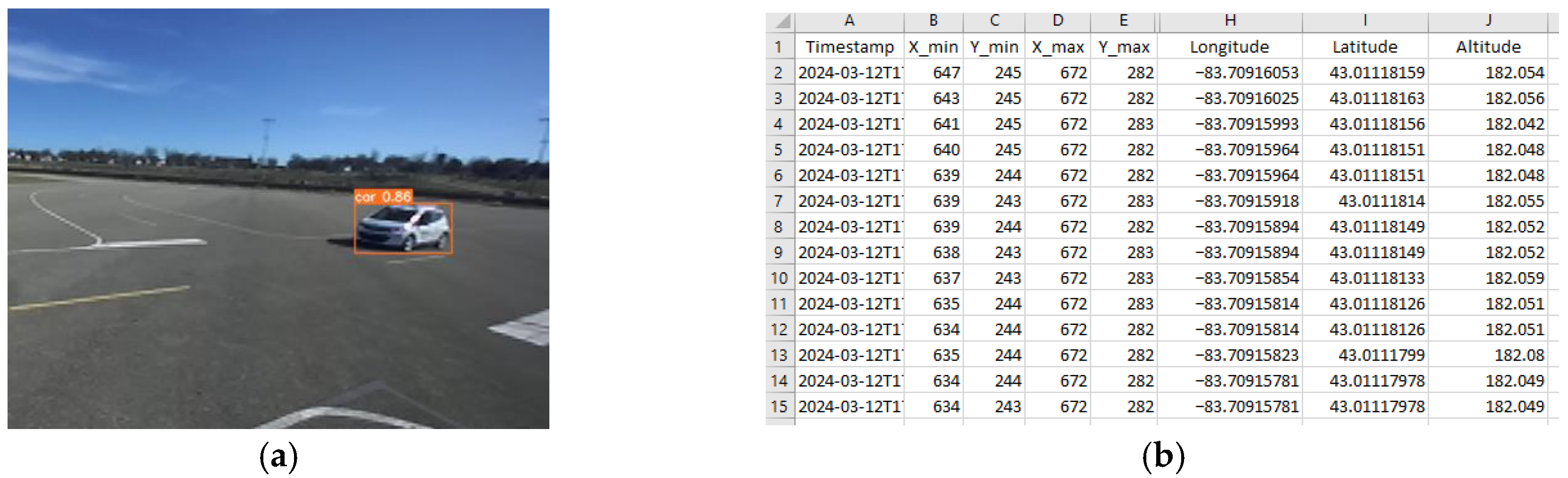 7] at Kettering University. This infrastructure included one RSU, one camera, and one edge computer. OBUs are installed within vehicles, transmitting vehicle-specific information to the RSUs while concurrently receiving data about traffic and surrounding conditions from RSUs. The edge computing device in the infrastructure is connected to the server computer via a client–server protocol to enable rapid data processing for the DNN-based object detection algorithm. A module that maps the detected objects’ GPS locations is developed to provide helpful information about detected objects. This GPS mapping algorithm finds the corresponding GPS coordinates from the 2D image coordinates. Basic Safety Messages (BSMs) are constructed by aggregating critical traffic information, including the GPS coordinates of detected objects, their object types, and associated confidence scores. The BSMs are transmitted from the RSU to OBUs using 5G sidelink technology. This real-time traffic information sharing supports proactive collision avoidance by enabling vehicles to anticipate and respond to potential road hazards.