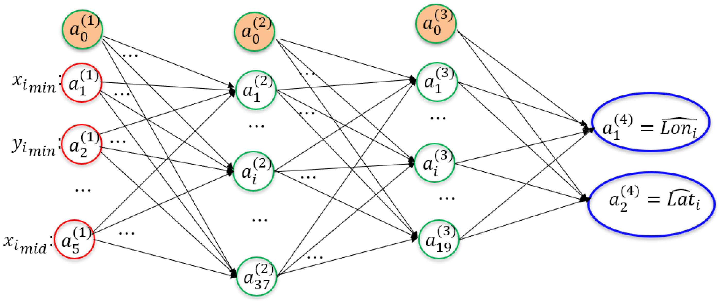 jth layer. The bias terms in layers were represented using the subscript 0. Among 9031 data samples, 85% of the data is used for training a backpropagation NN and the remaining 15% for validation. The NN model’s performance is measured using the Haversine formula [
