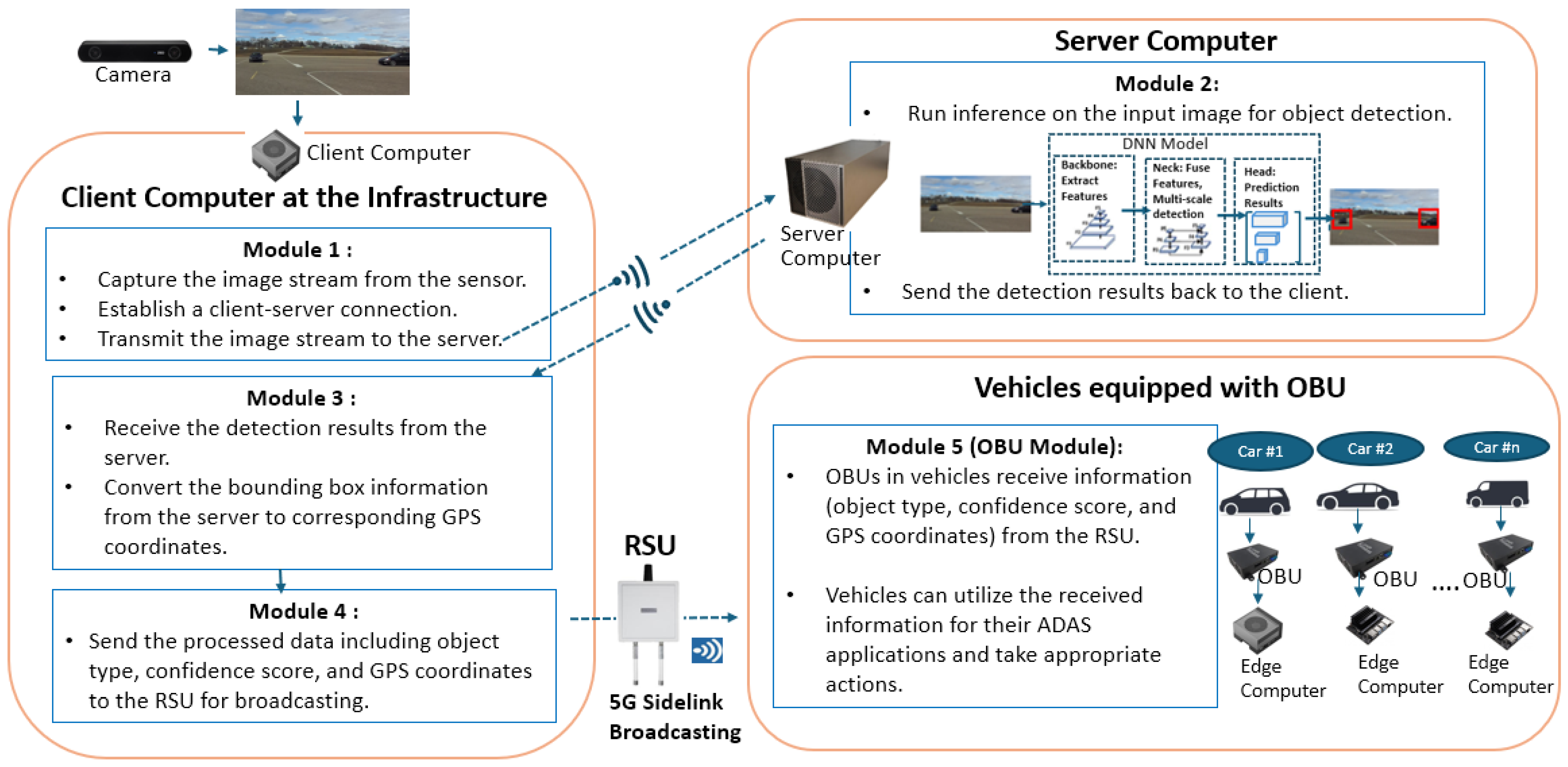 The steps for a co-operative C-V2X perception system for collision avoidance can be as follows: In Module 1, the system captures images of the intersection area using a camera sensor. These images are converted into byte-format BSMs by the client computer and transmitted to the server. In Module 2, the server decodes the received data and runs a DNN-based object detection algorithm, YOLOv5. The detection output—BB coordinates, object types, and confidence scores—is then encoded into byte-format BSMs and returned to the client. In Module 3, the client runs a GPS mapping algorithm to determine the GPS coordinates of each detected object, utilizing the bounding box information. In Module 4, the client transmits the processed data—including object GPS coordinates, types, and confidence scores—to the RSU using the UDP. The RSU then broadcasts the BSMs via 5G sidelink communication to nearby OBUs. In Module 5, OBUs installed in nearby vehicles forward the encoded data to their edge computing devices. These devices process the received data and can use it for their ADAS applications.