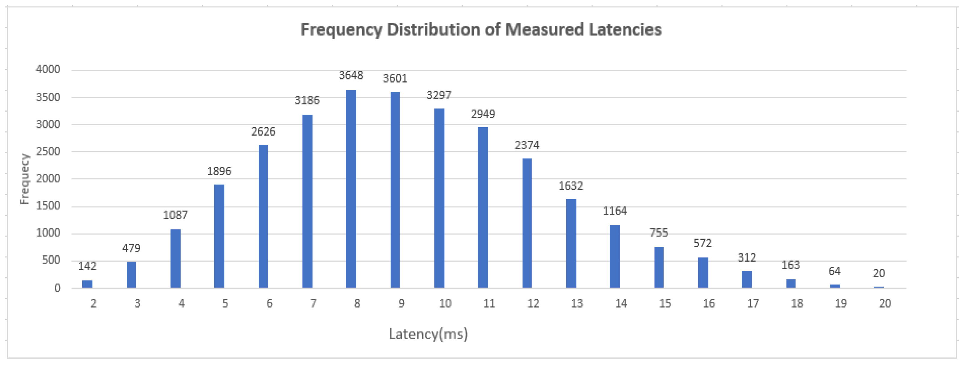Figure 10, a histogram with nineteen bins is presented, with each bin labeled on the x-axis by its center value. The histogram illustrates the frequency distribution of the measured latencies. The average latency was 9.24 ms, with a minimum latency of 2 ms and a maximum of 20 ms.