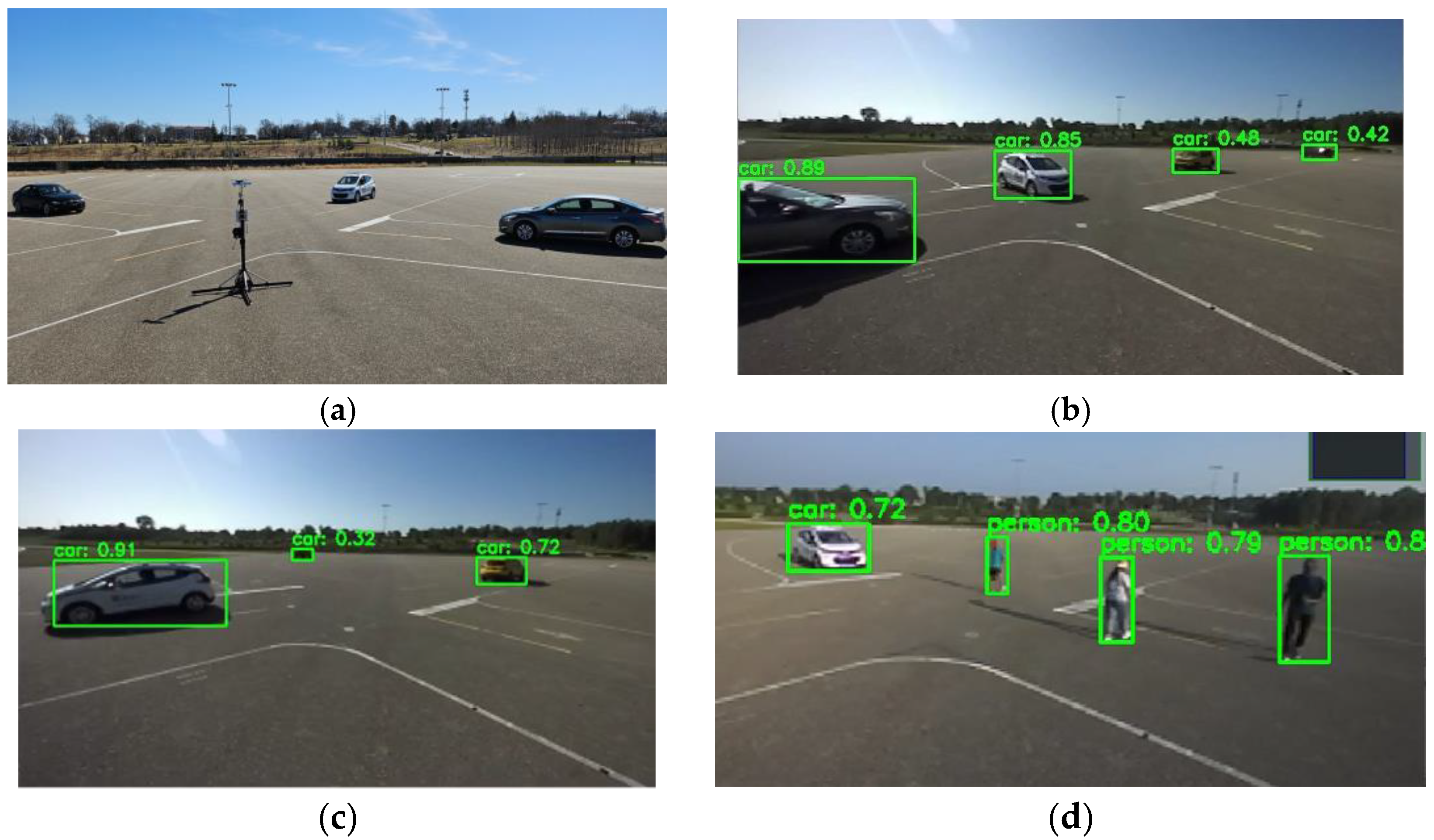Figure 11b–d show examples of object detection results displayed on the computer monitor at the infrastructure. In