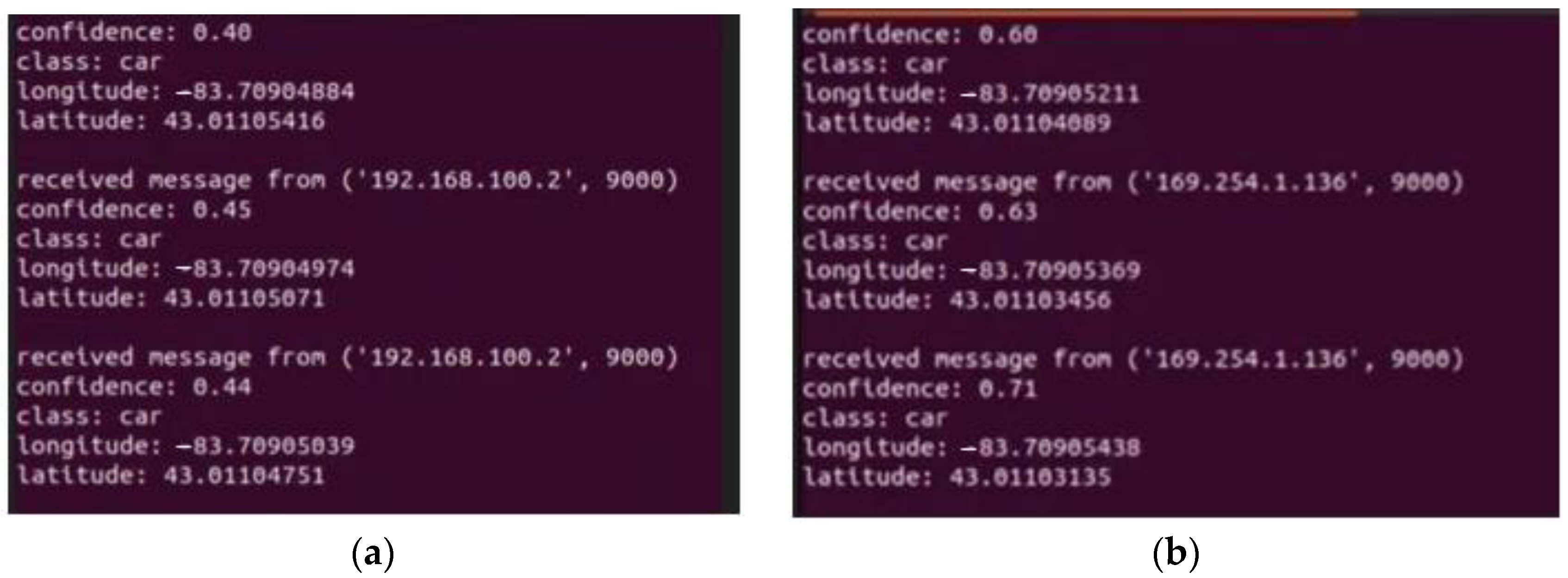 Figure 12 shows that test vehicles successfully received and visualized the real-time critical traffic information transmitted to their edge computing devices. This information includes object types, GPS coordinates, and confidence scores. The data is broadcast live from the RSU at the intersection to nearby OBUs in vehicles. In