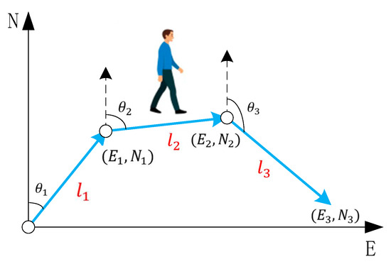 The schematic diagram of the PDR system is shown in Figure 1. is the coordinate of the starting point, is the coordinate of the position after walking n steps, is the step length after walking n steps, and is the heading angle after walking n steps. The position of the is