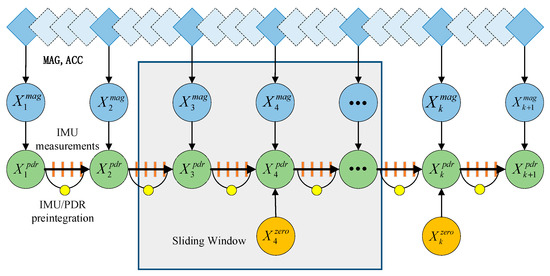 In the formula, is the corresponding part of , , , , have similar meanings, , are, respectively, the zero bias of the gyroscope and the zero bias of the accelerometer used when constructing the IMU/PDR pre-integration at the moment. IMU/PDR pre-integration constrained cost function is expressed as