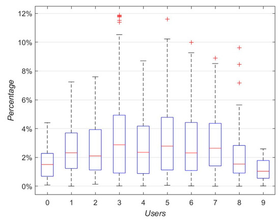 Figure 5 shows the prediction errors for 10 users. As can be seen, the average test error for these 10 users was approximately 2.38%. Users 3, 5, 6, 7, and 8 were outliers (the red “+”), likely due to differences in their walking characteristics during test data collection compared to those in the training dataset.