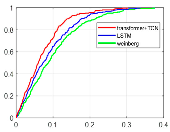Cumulative percentage of step error of transformer+TCN, LSTM, weinberg.