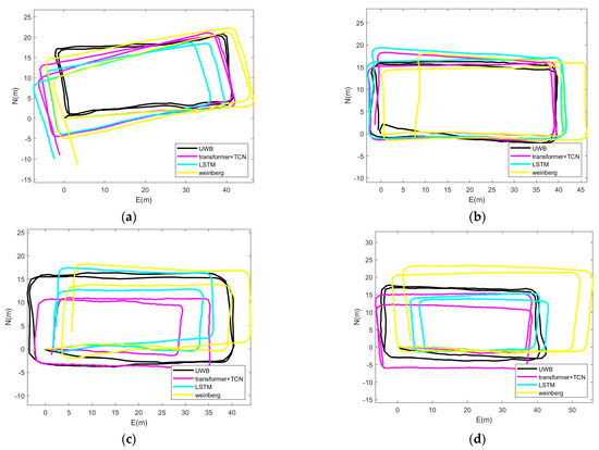 To validate the Transformer+TCN-based proposed PDR algorithm proposed in this article, we used UWB synchronized data acquisition as the real trajectory for comparative analysis. The walking trajectory is rectangular, with a length of 40 m and a width of 20 m. The terminal data are collected at a frequency of 50 Hz. Collect four modes: flat end, call, shake, and pocket. In order to verify the effectiveness of the algorithm proposed in this paper, the heading angle obtained by compensating the attitude sensor embedded in the intelligent handheld terminal was compared with the PDR based on Weinberg step size estimation and LSTM.