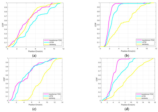 Cumulative percentage of position error of Transformer+TCN, LSTM and Weinberg. (a) Flat mode; (b) call mode; (c) hand-shaking mode; (d) pocket mode.