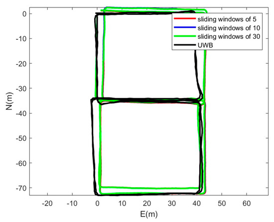In order to determine the size of the sliding windows, we tested the fusion positioning with sliding windows of 5, 10, and 30. We used the PDR/IMU/geomagnetic fusion positioning algorithm to obtain the trajectories with sliding windows of 5, 10, and 30, respectively, as shown in Figure 10. It can be seen that the larger the sliding windows length, the closer it fits the real trajectory.