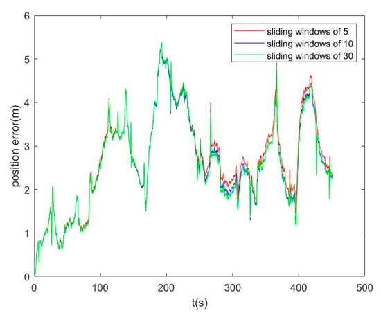 We analyzed the impact of different numbers of sliding windows on positioning accuracy, and the results are shown in Figure 11. There is no significant difference in the positioning effect of the three different sliding windows lengths in the first 250 s. As time goes by, the larger the number of sliding windows, the smaller the position error. However, the improvement of the number of sliding windows and positioning accuracy is not linear, so it is necessary to consider the fusion time of different sliding windows comprehensively.