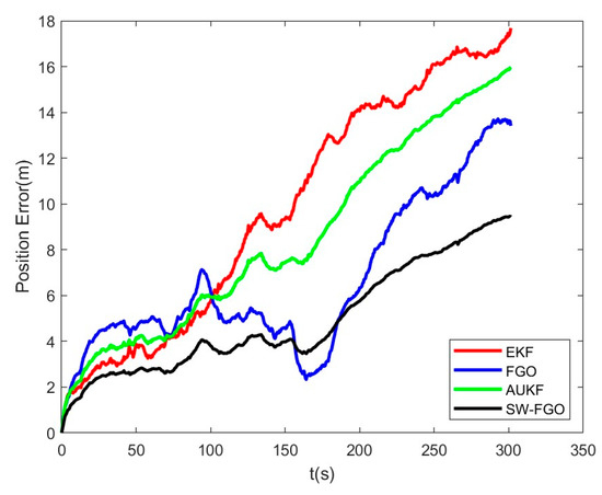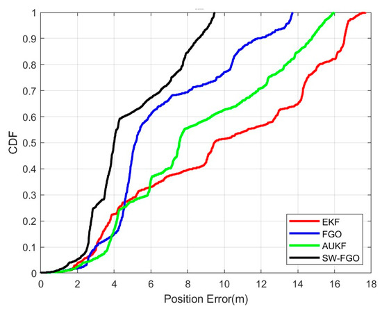 Figure 12 is the position error diagram of the EKF, AUKF, FGO and SW-FGO. In the 0–50 m range, the EKF performs better than the FGO, and in the 150–225 m range, the FGO error is smaller than the SW-FGO. However, the FGO error increases over time, with the final error of the SW-FGO reaching 9.43 m, the final error of the FGO reaching 13.41 m, the final error of the AUKF reaching 15.94 m, and the final error of the EKF reaching 17.68 m. This shows that the SW-FGO has lower position error and more accurate positioning than the EKF, AUKF, and FGO. Figure 13 shows the cumulative percentage of position errors between the SW-FGO, FGO, AUKF, EKF algorithms. A total of 70% of the errors for the SW-FGO algorithm are within 6.54 m, 70% for the FGO algorithm are within 8.11 m, 70% for the AUKF algorithm are within 11.82 m, and 70% for the EKF algorithm are within 14.28 m. This shows that the SW-FGO algorithm proposed in this paper has higher positioning accuracy and stability.