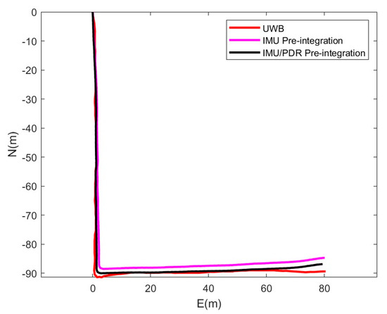 Trajectory comparison of UWB, IMU/PDR pre-integration and traditional IMU pre-integration.