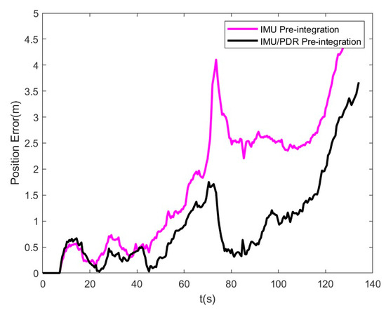 Next, we analyzed the position errors of IMU/PDR pre-integration and traditional IMU pre-integration. The results are shown in Figure 15. The blue error is slightly larger than the red error, 19 s after the start of walking. Subsequently, the blue error gradually becomes better than the red error. At the first turn, the errors of both methods experience a step-like jump, while the IMU/PDR pre-integration method quickly returns to normal. The final position error of the IMU pre-integration method is 4.68 m, while the IMU/PDR pre-integration method is 3.67 m, achieving a 21.6% improvement in positioning accuracy.