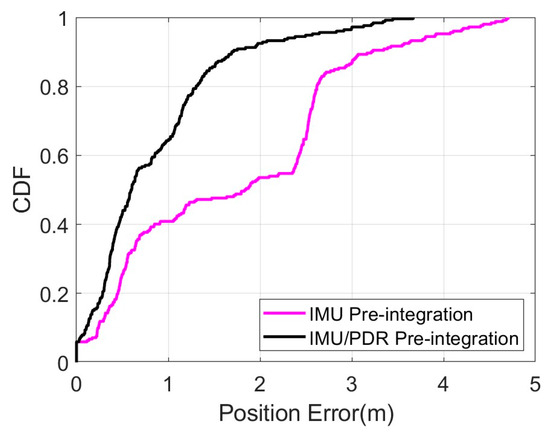 Finally, we compared the cumulative error percentages of the two different pre-integration methods, as shown in Figure 16. The positioning error at 80% confidence level using IMU/PDR pre-integration is 1.30 m, while the positioning error at 80% confidence level using IMU pre-integration is 2.62 m. This shows that IMU/PDR pre-integration can significantly improve positioning performance compared to traditional IMU pre-integration.