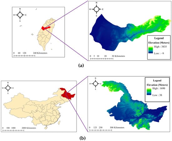 Study area: (a) First dataset, located in Taichung province in Taiwan; (b) Second dataset, located in Heilongjiang in China.