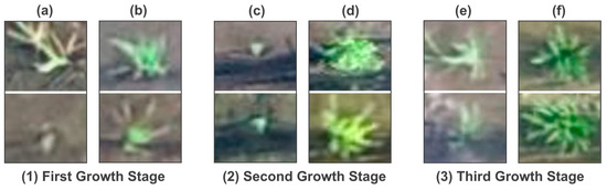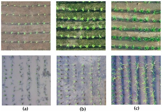 Examples of growth stages of rice seedlings dataset: (a) First growth stage; (b) Second growth stage; (c) Third growth stage. Above and below rows are the images for the first and second datasets, respectively.