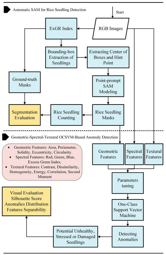 To address these challenges, this study introduces a novel, label-free framework for automated rice seedling segmentation and stress assessment across three growth stages using UAV-acquired RGB imagery. The method integrates SAM for segmentation, extracts morphological, spectral, and textural features, and employs OCSVM for anomaly detection to identify potentially stressed or unhealthy seedlings. This study builds upon the authors’ previous work [44], where the applicability of the SAM was evaluated for rice seedling segmentation under three prompting scenarios: point prompts, bounding-box prompts, and automatic mask generation, all relying on user-provided inputs from the source dataset. In contrast, the present manuscript introduces a fully automated framework that eliminates the need for manual inputs. Additionally, this work advances beyond segmentation by analyzing seedling health. To check the scalability of the approach, the entire process was also applied to a second, independently curated dataset.
