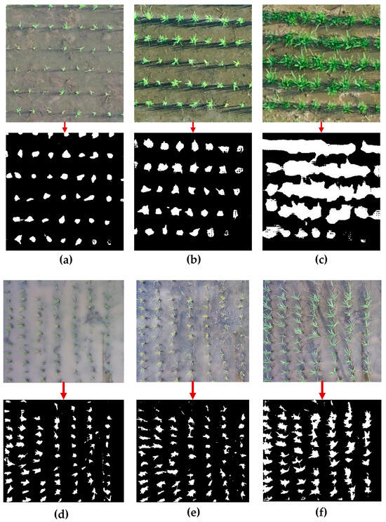 Segmentation results of rice seedlings for varying growth stages: First dataset: (a) 7 August 2018; (b) 14 August 2018; (c) 23 August 2018; Second dataset: (d) 1 June 2022; (e) 6 June 2022; (f) 11 June 2022.