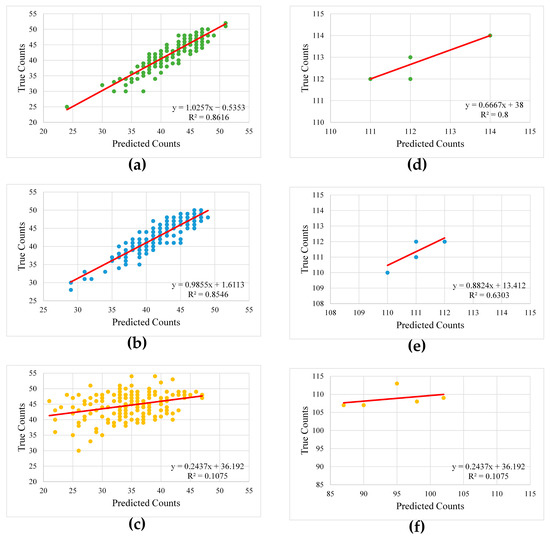 Predicted counts versus the ground truth counts for each growth stage: (a–c) first, second and third growth stage for the first dataset; (d–f) first, second and third growth stage for the second dataset, respectively.