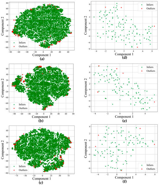 After performing OCSVM, t-SNE is used to project features into 2D and colored points by OCSVM labels to visualize separation. The scatter plots are shown in Figure 7.