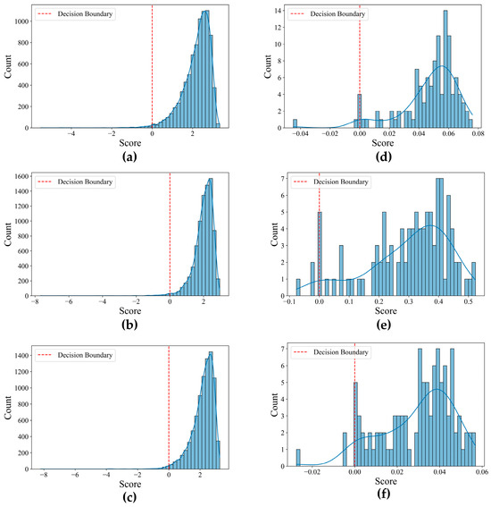 Decision function plot and distance of samples from separating hyperplane: (a–c) first dataset: 7 August 2018, 14 August 2018, 23 August 2018 and (d–f) second dataset: 30 May 2022, 7 June 2022, 14 June 2022, respectively.
