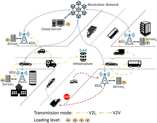 According to the rapid development of ITSs and connected cars, the demand for computationally expensive and real-time applications such as autonomous driving, traffic prediction, and vehicle-to-everything (V2X) communication has increased exponentially. The traditional cloud-based task offloading solutions are afflicted with heavy latency, bandwidth limitations, and centralized management, which are not suitable for delay-sensitive applications in dynamic vehicular environments. To alleviate this problem, edge computing has been a promising approach, which offers the ability to offload tasks to edge roadside units (RSUs) or mobile edge computing (MEC) servers close to vehicles, hence reducing processing latency [1]. However, efficient task offloading in vehicular networks still faces a number of fundamental challenges. The heterogeneity of the vehicular network, dynamic characteristics of vehicle mobility, and changing network conditions make it challenging to achieve optimal task scheduling [2]. In addition, existing task-offloading systems are mainly centralized and rely on a centralized resource to offload computing resources. This results in trust issues, security risks, and potential single points of failure [3]. Beyond that, adequate evidence and decentralized incentive mechanisms to encourage computing resource sharing between vehicles, MEC nodes, and cloud servers are lacking. Current task offloading solutions do not support automatic and equitable reward distribution, thereby discouraging participation by providers of resources. For this purpose, the application of blockchain technology provides a secure, trustless, and decentralized approach to task offloading and management of computational resources [4,5]. Task allocation can be made transparently through smart contracts without relying on a central authority. While the potential of blockchain brings tremendous opportunities, vehicle edge computing integration also raises new challenges, such as task scheduling optimization in network-limited environments, low-latency transaction guarantees, and realizable consensus protocols for efficient high-throughput computation offloading in massive-scale ITS applications.