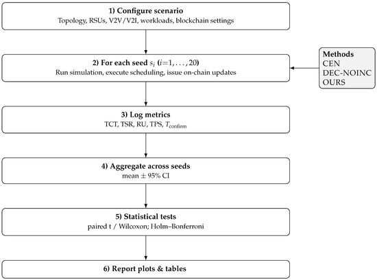 All methods use identical workloads, mobility traces, deadline distributions, and feasibility thresholds (compute/bandwidth/loss) to ensure a fair comparison. For plotting and tables, we use consistent abbreviations: CEN = Centralized Offloading; DEC-NOINC = Decentralized Offloading without token incentives (blockchain used for coordination/logging, staking/reward disabled); OURS = Blockchain-Based Offloading with token incentives. Each configuration is run for 1000 time slots and repeated times with distinct random seeds; we report mean ± 95% confidence intervals and conduct paired t-tests (or Wilcoxon when normality is violated) with Holm–Bonferroni correction (see Section 6.1). The evaluation procedure is summarized in Figure 3.