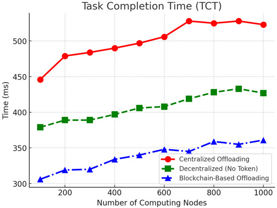 Figure 4 shows the task completion time (TCT) of the three schemes under different numbers of computing nodes. The blockchain-based offloading technique always shows the shortest task completion time, with latency reduced between 12.5% and 24.3% compared to centralized offloading. The decentralized mechanism without token incentives is also preferable to the centralized technique, but not as good as the blockchain-based mechanism. As the number of computing nodes increases, all methods experience a slight increase in task completion time due to communication overhead and congestion, but the blockchain method is the most stable.