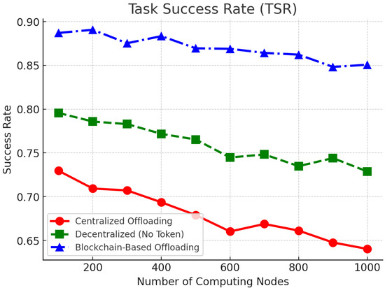 Figure 5 illustrates the task success rate (TSR) against the number of computing nodes. The blockchain-based solution achieves the highest success rate, 84.2–88.5%, 6.8–9.4% more than the decentralized model, and 15.7–23.1% more than the centralized model. The reason lies in the fact that adaptive resource allocation enables dynamic mapping of computational tasks to nodes with available resources. The centralized strategy is plagued by reduced success rates, mainly because of poor resource awareness and the potential for bottlenecks at congested nodes.