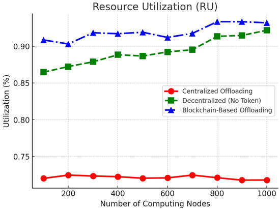 Figure 6 gives the resource usage (RU) of different computation nodes. The blockchain system optimizes computational efficiency to such an extent that the usage of resources is kept between 88.9% and 92.7%, far beyond that of the centralized system of around 71.8%. The economically incentivized–decentralized architecture slightly improves efficiency compared to the non-incentivized decentralized model, which results in resource utilization of 85.5–89.3%. This validates and reaffirms the fact that the token-based rewarding method in blockchain ensures a more efficient and fair resource supply approach.