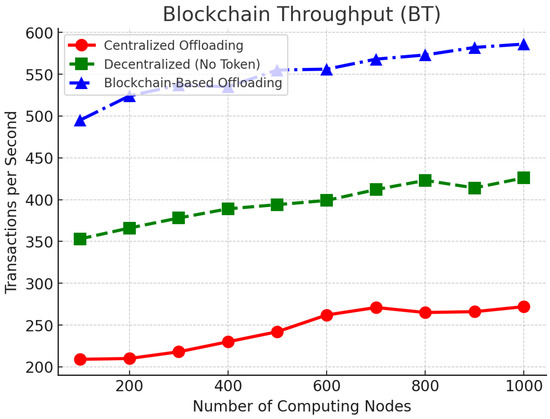 Figure 7 measures the blockchain throughput (BT) in terms of transactions per second processed. Our offloading protocol consistently achieves transactions per second with a 10-second block interval, providing scalability for large-scale deployment. The decentralized approach without token incentives offers moderate throughput, peaking at 415 transactions per second, while the centralized model struggles to exceed 275 transactions per second, as it faces coordination bottlenecks. The results verify that the blockchain model is highly scalable and can efficiently allocate real-time computational tasks in an ITS environment.