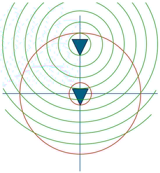 Translation of origin of the antenna as is used within this paper, where the blue triangle denotes the antenna, the red circle denotes the antenna’s minimum radial extent before and after the translation, and the green circles the phase fronts after the translation.