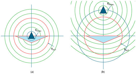 Translation of origin as used in spherical near-field antenna measurements: (a) untranslated case where probe and AUT coincide and (b) translated case where the probe is translated outside the AUT minimum radial extent. Here the blue triangle represents the probe, and the larger light blue triangle represents the AUT. Here, red and blue circles denote the minimum radial extent of the AUT and probe, respectively, and the green circles denote the wave fronts due to the probe.
