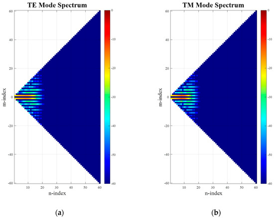 Mode spectra of simulated SGH at 1 m offset: (a) TE modes; (b) TM modes using the translation used in spherical near-field antenna measurements.