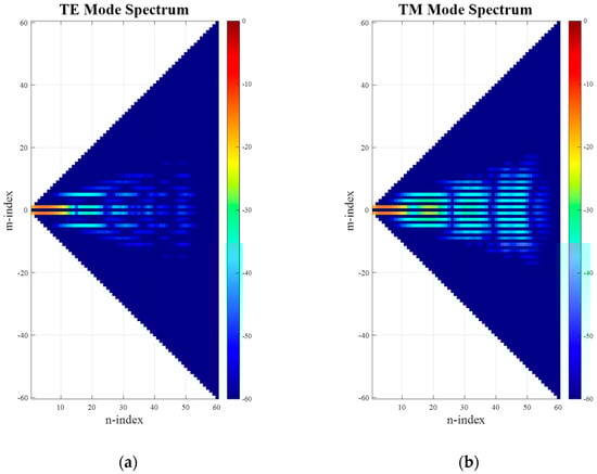 Mode spectra of simulated SGH at 1 m offset: (a) TE modes; (b) TM modes using Equation (1).
