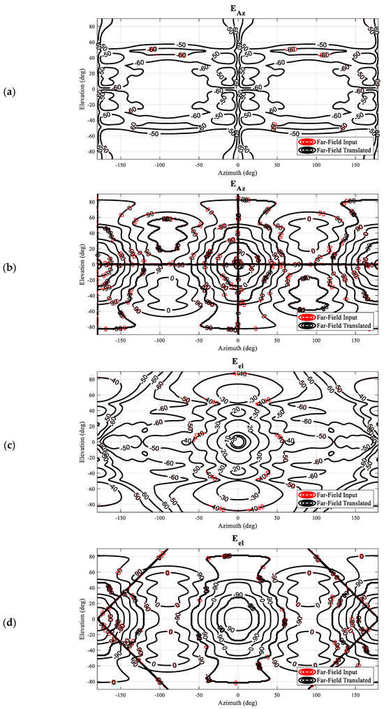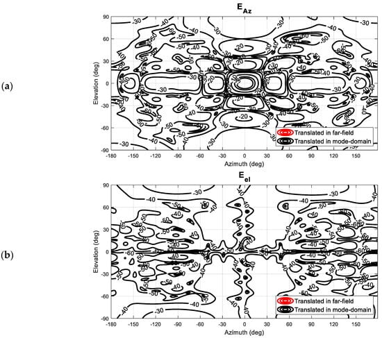 Next, we may translate the antenna back to its original position by utilizing the vector addition theorem presented above to implement an equivalent translation directly upon the SMCs. In the case that the mode translation operation works correctly for this case, the resulting far-field amplitude and phase patterns should agree exactly with the initial starting data. In Figure 5, comparison contour plots of the simulated antenna (input) and the back-translated patterns are shown tabulated on a regular azimuth-over-elevation grid, denoted by red and black contours, respectively. Here, it can be seen that for both field components, the amplitude patterns (a) and (c) are nearly indistinguishable from one another. The phase distribution of the elevation field component, which represents the co-polar pattern, is found to have an excellent match as well, while the cross-polar azimuth field component shows a little larger difference between the input and the translated data. One has, however, to keep in mind that the respective amplitudes are more than 50 dB below the pattern peak, and most likely the differences are caused by the higher-order mode cut-off of the mode spectrum of the shifted pattern, as well as numerical truncation and rounding, rather than due to the translation operation itself. That being said, the co-polar and cross-polar amplitude and phase patterns are all in such good agreement that each of the contours overlays precisely, with even the positions of the contour labels coinciding, which is a very encouraging result indeed.