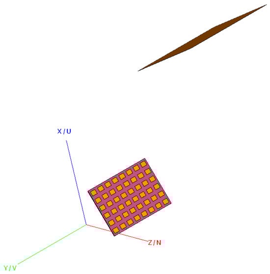 To further validate the application of the generalized vector addition theorem to the mode-filtering-based reflection suppression, a numerical model has been created using the proprietary full-wave three-dimensional computational electromagnetic solver Altair Feko [20]. To make the simulation sufficiently realistic, a model of a 48-element planar array antenna was simulated and used as an AUT [21]. The spherical near-field measured pattern of the AUT was then perturbed with the inclusion of a perfect electric conducting (PEC) square plate, which was included to create the requisite complex environment and provide the parasitically coupled scatterer. Figure 6 shows the experimental configuration in the modeling software. By stepping the orientations of the model of the AUT through a sequence of rotations, a measurement using a traditional “roll-over-azimuth” positioning system [6] was simulated. Figure 6 shows a randomly chosen example where the AUT has been rotated to the virtual measurement angle of . In this particular simulation, the AUT was located displaced by 360 mm from the origin of the simulated spherical “measurement” setup, in z-direction of the AUT coordinate system. On the top-right-hand side, a large PEC scatterer can be seen. Here, the center of the reflecting plate is positioned 1000 mm above and right from the global coordinate system origin and oriented at approximately to the yz-plane, which results in a maximum effect in disturbing the far-field pattern of the AUT. It is further emphasized that the location and orientation of the plate remain statically located with respect to the global coordinate system, which mirrors the practical case of a scatterer that is located at a fixed position within the test chamber. The amplitude and phase distribution of the AUT was previously described in reference [21]. While the excitation is not especially important for the present work, the general complex nature of the field distribution makes it far more attractive than a simple analytical field such as that used above to confirm the validity and applicability of the translation algorithm itself.