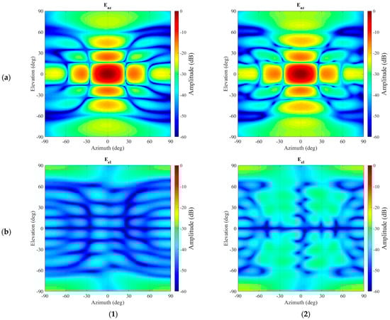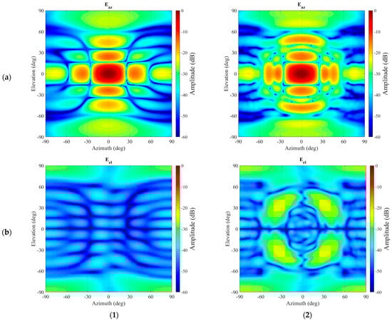 Azimuth-over-elevation projection of the far-field of the antenna without (1) and with (2) interference present: (a) Amplitude of the azimuth polarization component. (b) Amplitude of the elevation polarization component.