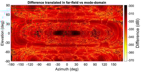 Based on the performed comparisons shown in Figure 5, it can be concluded that the translation of origin described can be used as an alternative to the far-field pattern-based displacement operation, which multiplies the far-field antenna pattern function with a complex exponential, , and filters out any evanescent fields. And, as has been verified previously, cf. [19], the mode translation can be applied in any direction and not merely along the z-axis. Appendix B below contains a further example of the verification of a general translation that was specifically not aligned with the z-axis.