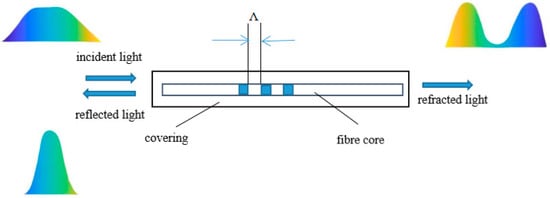 FBG sensor is a typical wavelength modulation sensor, which is mainly etched by excimer laser or ultraviolet exposure. When the broadband light source reaches the gate region, the light meeting the specific wavelength is reflected, while the light not meeting the specific wavelength is transmitted, and the resulting reflection spectrum presents a peak centered on Bragg wavelength, which is called Bragg wavelength [21]. The Bragg wavelength is the central peak wavelength in the FBG reflection spectrum, representing the specific wavelength at which coherent reflection occurs. The FBG sensing principle is shown in Figure 1.