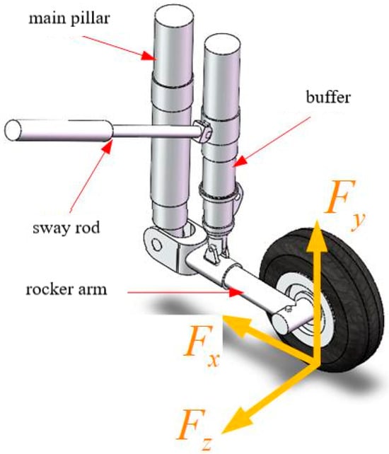 Taking the reverse heading as the X axis, the direction perpendicular to the ground as the Y axis, and the section perpendicular to the hub as the Z axis, a space rectangular coordinate system is established. In order to facilitate the study, the complex space loads borne by the main landing gear in the stages of catapult takeoff, landing and deck operation can be simplified and decomposed into heading load , vertical load and lateral load , as shown in Figure 2. The three-dimensional load on the ground is transmitted to the lower rocker arm of the main landing gear through the wheel, and then transmitted to the fuselage through the buffer, main strut, diagonal strut and other structures. Because of the buffering effect of the hydraulic structure of the strut, the large ground three-dimensional load generated when the main landing gear takes off or lands is greatly reduced when it is transmitted to the fuselage through the buffering strut, so the response of the rocker arm structure directly connected with the wheel can best reflect the real ground three-dimensional load, and the relative position from the point where the wheel load acts to the rocker arm does not change with the stroke of the buffer.