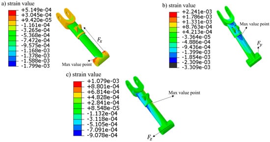 Finite element simulation strain nephogram of landing gear rocker arm. (a) heading loading (b) vertical loading (c) lateral loading.