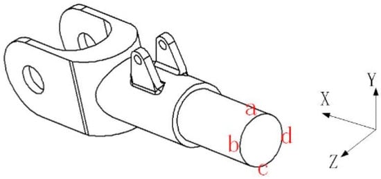 As can be seen from the above simulation cloud picture, when the rocker arm structure is subjected to the heading load (Figure 3a), the compression occurs at ‘a’, ‘b’, ‘c’ and ‘d’ of its cross-section. When the rocker arm structure is subjected to vertical load (Figure 3b), the position ‘a’ of its circular shaft section is compressed, and the strain is about με, and the corresponding position ‘c’ is stretched, and the strain is about με. The positions ‘b’ and ‘d’ are equivalent to the neutral layer of the structure under bending moment, and the strain is close to zero. When the rocker arm structure is subjected to lateral load (Figure 3c), the point ‘b’ of the rocker arm structure is compressed, and the strain is about με; the corresponding point ‘d’ is stretched, and the strain is about με. The point ‘a’ and ‘b’ are equivalent to the neutral layer of the structure when subjected to bending moment, and the strain is close to zero.