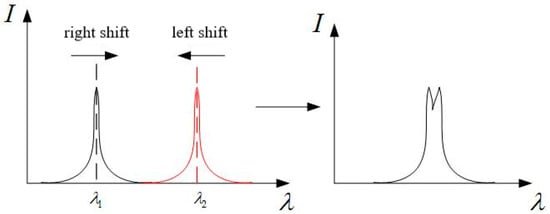 Four sensors on section A are welded together to form line 1, which is quasi-distributed strain sensing. At this time, the initial center wavelength spacing of four FBG sensors needs to be considered. If the wavelength spacing between adjacent sensors is too small, when the center wavelength shifts, the superposition of two peaks will lead to the failure of Fung Cham algorithm(the peak detection algorithm integrated within the demodulation instrument), resulting in erroneous strain data, as shown in Figure 6. Figure 6 demonstrates the spectral overlap phenomenon that occurs when the initial central wavelength spacing between adjacent FBG sensors is too small and wavelength shifts occur. In the left diagram, the reflection peak corresponding to shifts to the right, while the peak corresponding to shifts to the left, resulting in an overlap between their peak regions. The right diagram shows the morphology of the superimposed spectrum: the originally distinct two independent peaks merge into a distorted spectral profile with a bimodal structure. Such spectral distortion can cause the Fung Cham peak detection algorithm embedded in the demodulator to fail in accurately identifying the peak positions, thereby leading to erroneous strain data interpretation.
