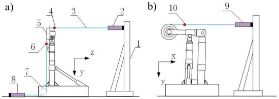Figure 7 presents a simplified 2D model of the loading system, with component numbering specifications provided in Table 1. During loading operations, the hinge mechanism of the diagonal strut becomes locked, maintaining a fixed angular position relative to the Y-axis. The system employs three actuators (numbered 2, 8, and 9) to apply lateral, vertical, and heading loads, respectively. Corresponding force measurements are obtained through sensors numbered 4 (lateral load), 6 (vertical load), and 10 (heading load), which monitor the forces exerted on the dummy wheel structure. Notably, actuator no. 8 incorporates a pulley mechanism to redirect the applied load into the vertical direction.