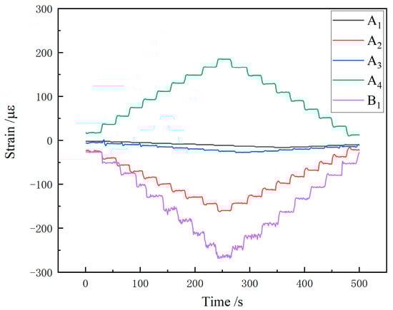 where the is strain response coefficient under the corresponding load. Therefore, when , the response coefficient of heading load can be measured by single heading loading; Similarly, by controlling , the strain response coefficient of vertical load can be measured through a single vertical loading; By controlling , the strain response coefficient of lateral load is measured by unilateral loading. Based on this, three unidirectional loading conditions are designed, the maximum value of unidirectional loading is , and the single-stage increasing load is . According to the maximum limit load of heading load (), vertical load () and lateral load (), the load value of 10 grades is designed in equal proportion, and it will increase step by step when loading.