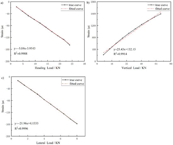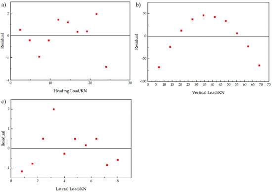 Figure 9 is the strain acquisition curve of five measuring points under the condition of lateral single loading, which shows that when lateral single loading is applied, measuring point and is compressed, the measuring points are stretched, and the measuring points and are located below the neutral axis of the rocker arm, then they are both compressed, which is consistent with the simulation trend. The least square fitting is carried out between each level of load and the corresponding strain value in the unidirectional loading condition. Taking sensor as an example, the fitting results of its three unidirectional loading fitting results are shown in Figure 10a–c. Figure 10a presents the fitted curve under the heading single-sided loading condition. The black solid line represents the measured strain curve (true curve), while the red dashed line denotes the least-squares fitted curve (fitted curve). The strain exhibits a clear linear negative correlation with the heading load, with a fitting equation of and a coefficient of determination , indicating exceptionally high fitting accuracy. Figure 10b shows the fitted curve under the vertical single-sided loading condition. In this case, the strain demonstrates an approximately linear positive correlation with the vertical load. The fitting equation is , with , reflecting a strong fitting performance. Figure 10c illustrates the fitted curve under the lateral single-sided loading condition. Here, the strain displays an approximately linear negative correlation with the lateral load. The fitting equation is , with again indicating an excellent level of fitting accuracy. The residual plot for the regression analysis in Figure 10 is shown in Figure 11.