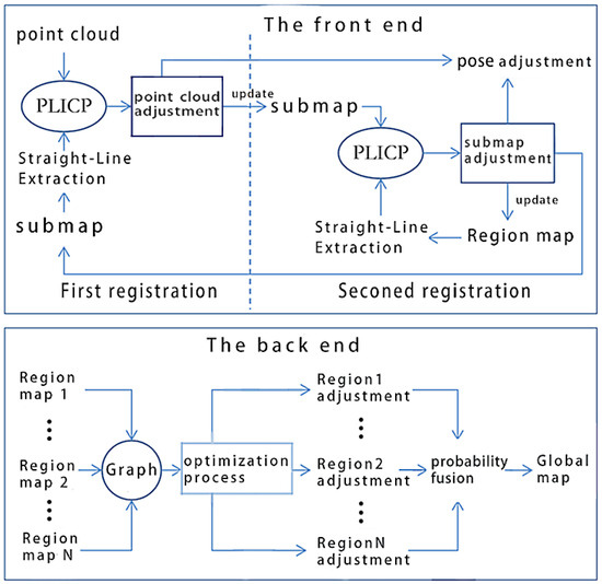 The proposed method divides the workspace into several relatively independent regions at a set distance interval and fuses the robot’s submap within the region to obtain a regional map. At the beginning of the robot’s work, the regional map has not been established and the submap is directly used to update the regional map. After the regional map is established, the improved PLICP method is applied to align the submap and the regional map and then update the regional map with the adjusted submap.