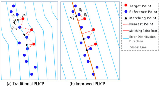 In the traditional PLICP algorithm (Figure 2a), the target point uses its perpendicular foot on the line as the matching point. The distance from pi to the line is treated as the error term. As can be seen from the blue lines in the figure, the error distribution directions corresponding to each data point in the reference point cloud are inconsistent, depending on the relative positions of adjacent points.